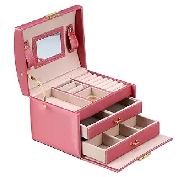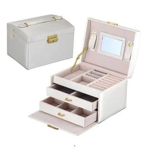 Con acabado en piel sintética y detalles finamente elaborados, transmite un aire de distinción mientras resguarda cada pieza de joyería con delicadeza. El espejo incorporado y el sistema de cierre añaden practicidad y seguridad, haciendo de este joyero un aliado indispensable para tu día a día.